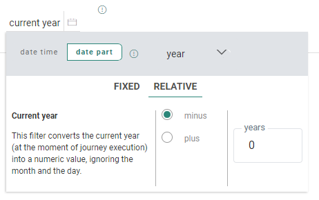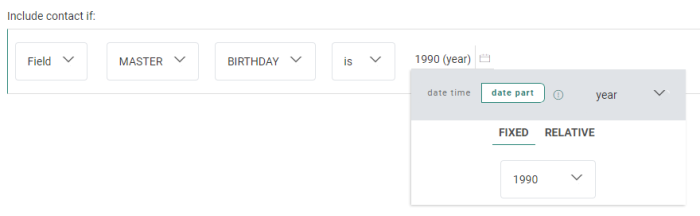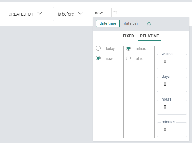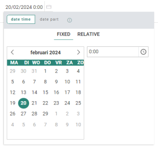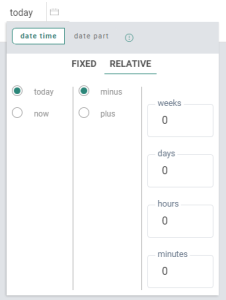 The 'date time' picker allows you to select a fixed or relative date (for date fields) or date/time (for date/time fields).
