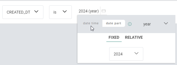 For date and date-time fields, different date selections are provided, where you can choose between a 'date/time' or a 'date part' (hour, day, month, month/day, year). See below for more info on date/time filters.