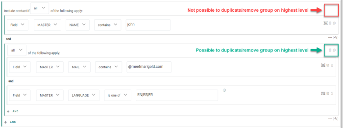 An extra block around a group constraint shows: Include contact if all/any of the following apply.