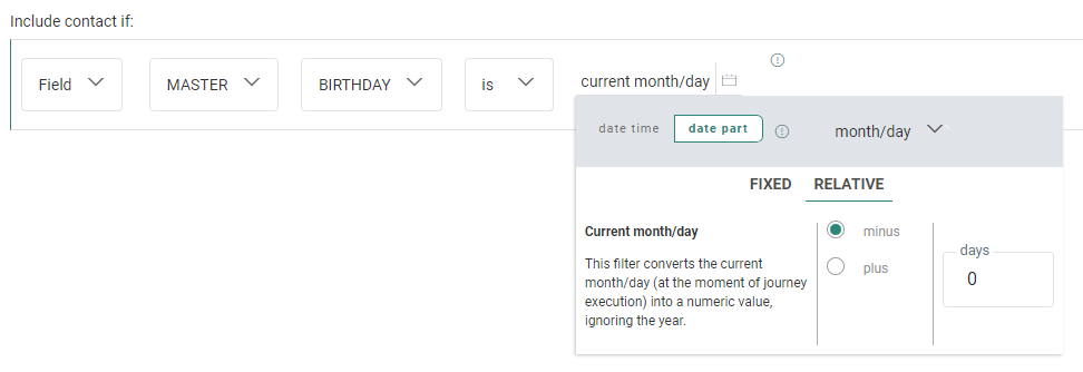 Note : Relative datetime constraints (e.g. now, today) are evaluated against the server datetime.