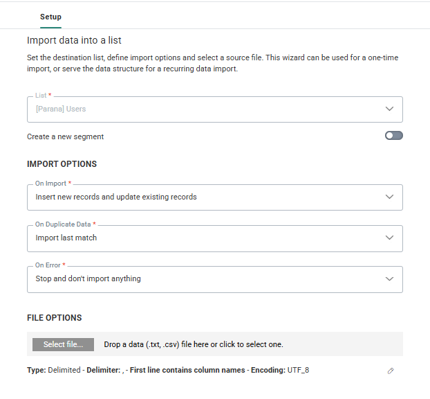 When importing into a list or segment that contains already records, you must define what needs to happen on import.