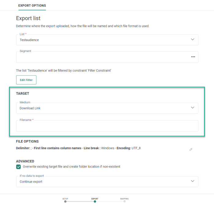Overwrite existing target file — If the selected target file already exists, it will be overwritten if the option is selected. If the option is not selected the export will fail upon execution.