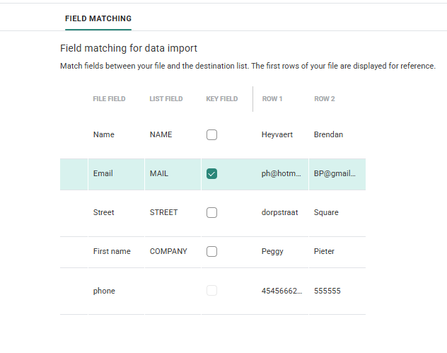 6. Finally, indicate the fields that are used as key field. This key field is used to link a record in the import file to a record on the list.