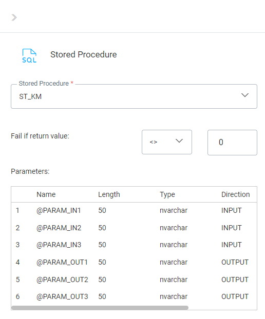 On failure — Route to take if the Stored Procedures’ return value matches the failed constraint (e.g.: return value <> 0).