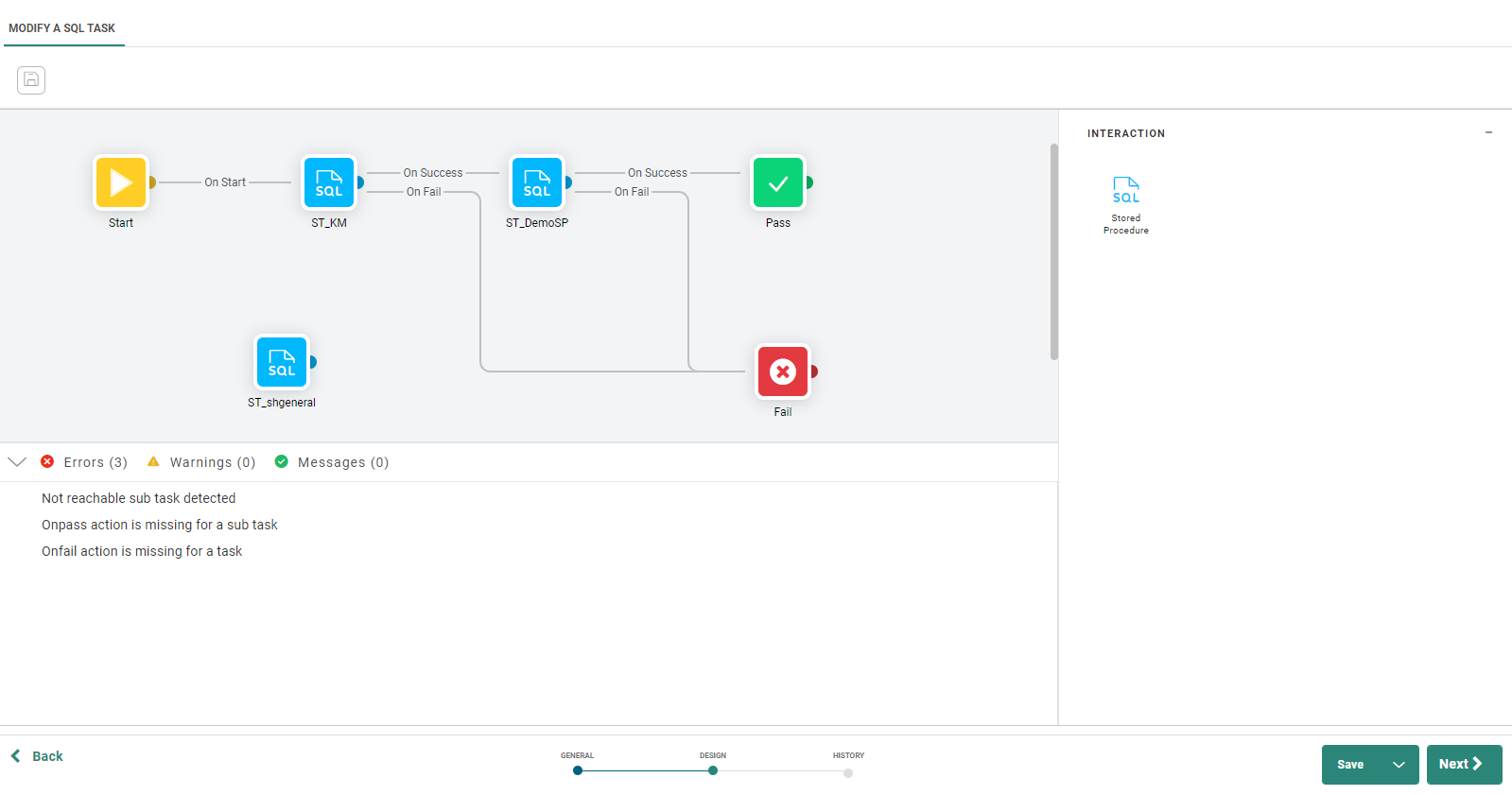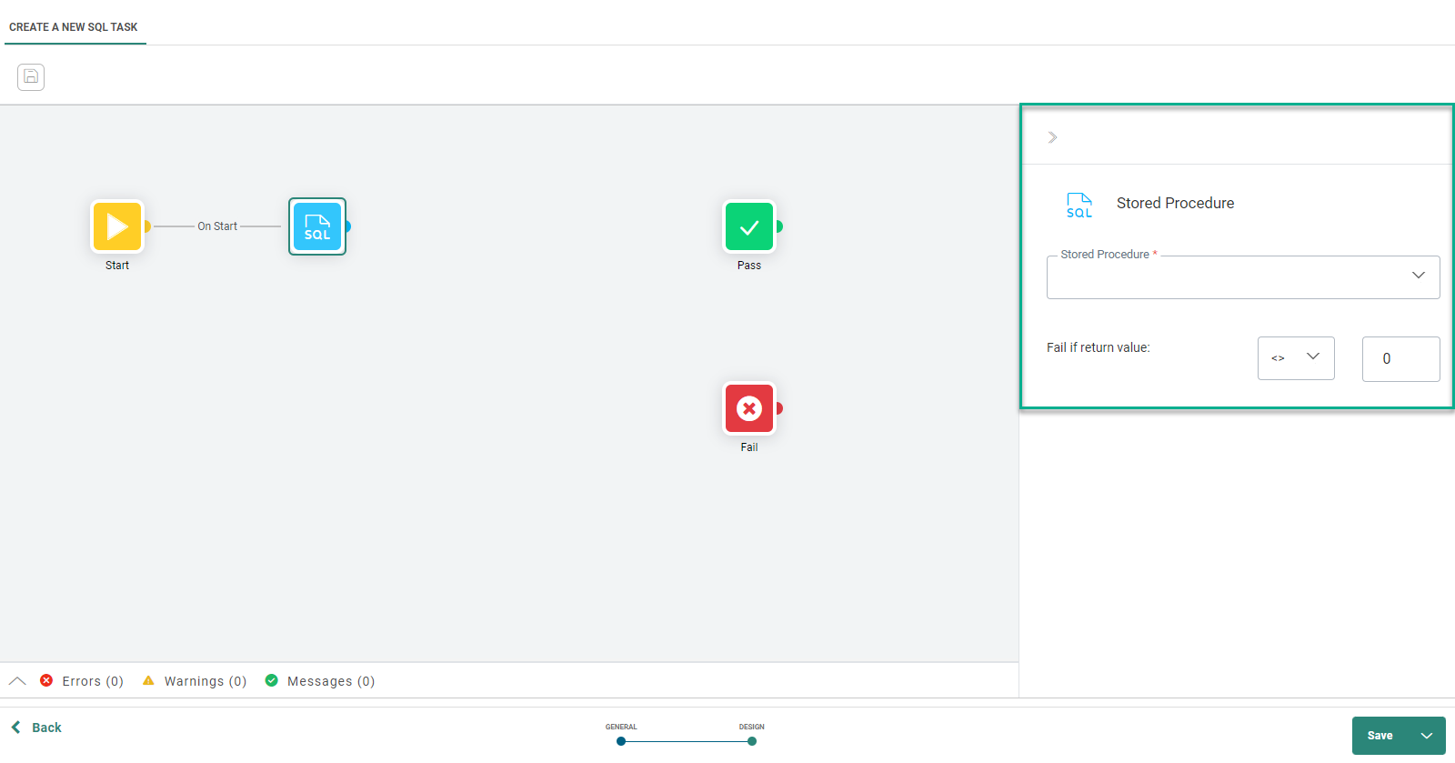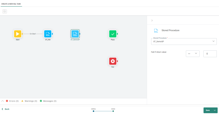6. When done defining the flow of the SQL Task, press Save. A validation of the SQL Task is performed and errors, warnings and messages are listed: