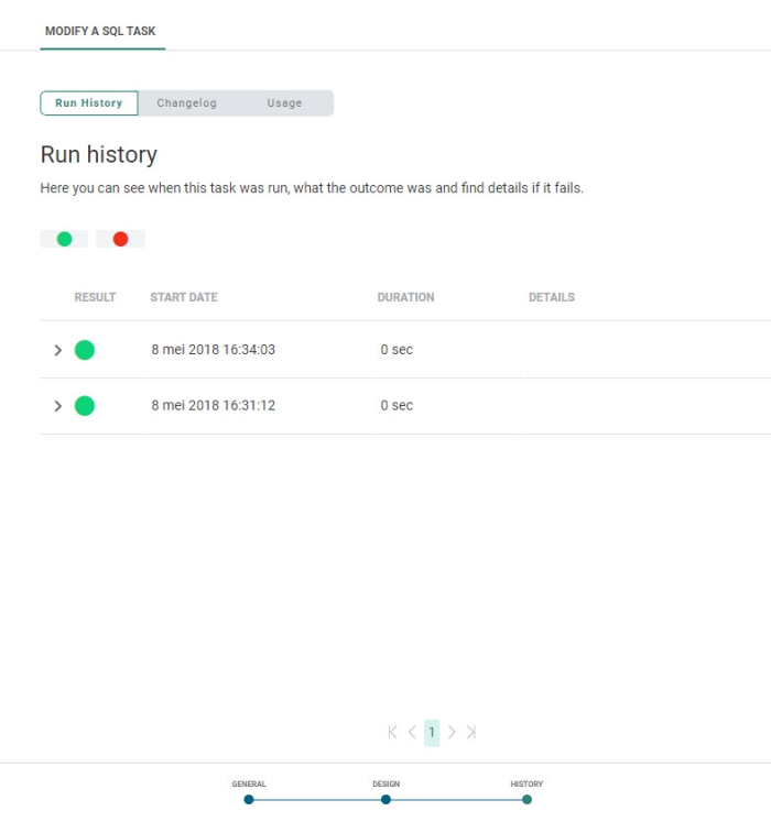- when the task was executed and the status of that execution. This information can be found on the Run history tab. If the task comprises subtasks, the execution history of these tasks can be consulted as well.