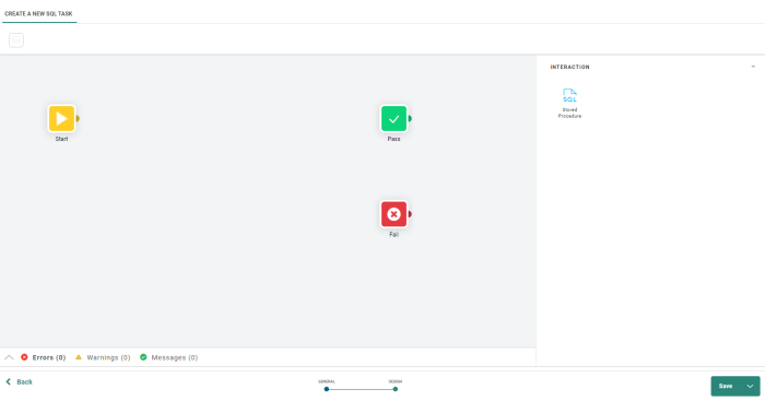 Note: The default Pass and Fail Components indicate when the SQL Task succeeds or fails and are the end point for this flow.