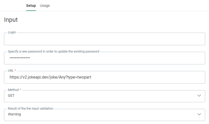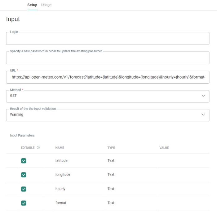 2. URL — This is the URL of the HTTP request. It is recommended to use secure HTTPS connections. The URL must also contain the input parameters. They are added using the following syntax: PARAM1={xxx}. When the URL is set with input parameters, these are automatically extracted and displayed in a grid.