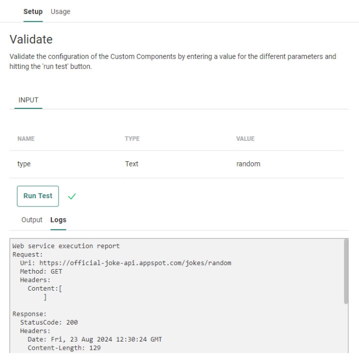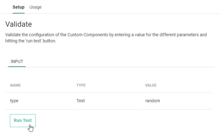 The next step shows the input parameters with their default values (according to the type of Custom Component — see the different types below).