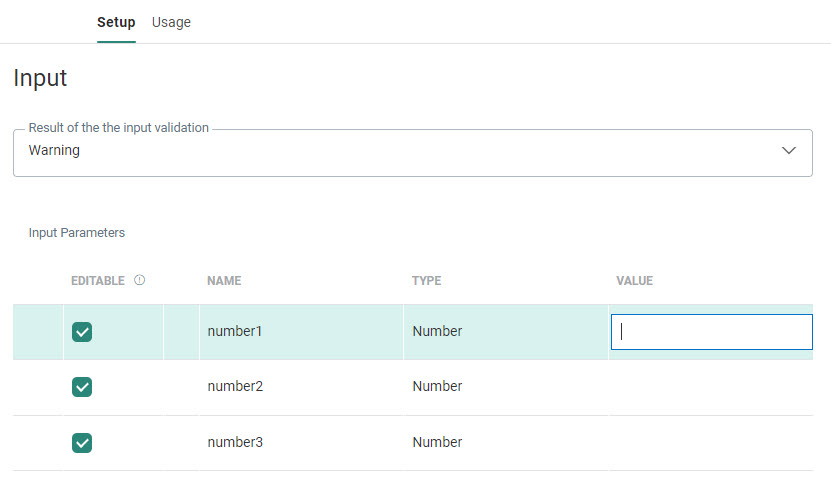 Note: The following types of Input parameters can be set: Text, LongText, Boolean, Date, Datetime, Numeric, Float, Long and Option List.