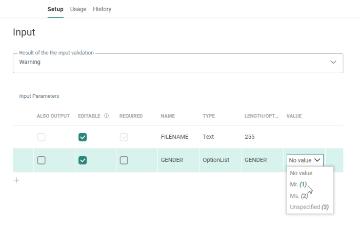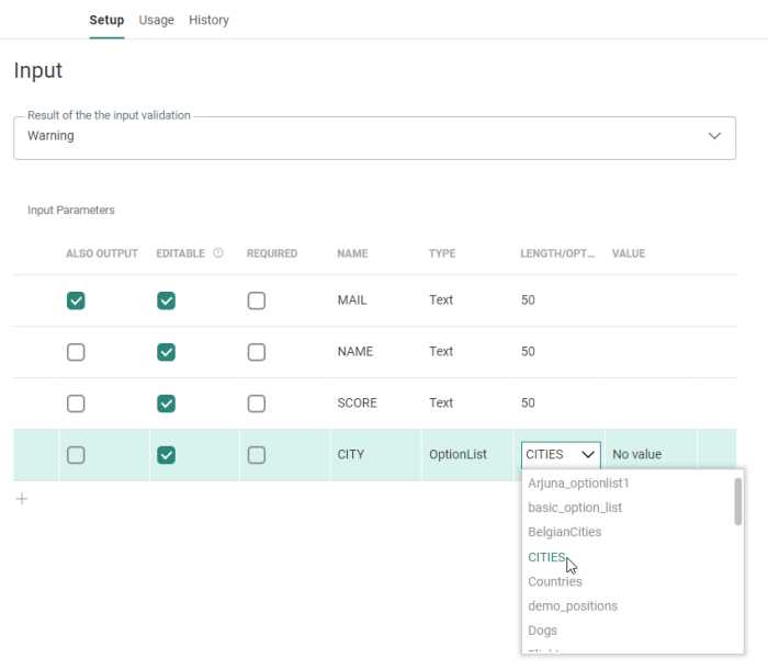 When Option List is selected as type of input parameter, you can select the Option List from the drop-down in the Length/List field. An optional default value can be set in the Value column.![]()