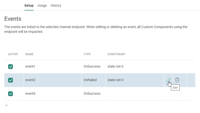 Note: Each custom event will also be available for all other Custom Components using this custom channel. Use the Active toggle to activate/deactivate events for a specific Custom Component.