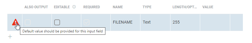 When you set a parameter as 'non-editable' (uncheck the checkbox) while it's a required parameter and no default value is set (in the last column), an error icon appears :