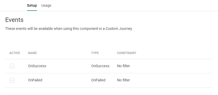Events can be activated for a specific Custom Component. This defines if the event will be available in the Journey when this Custom Component is used.