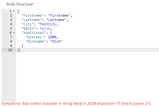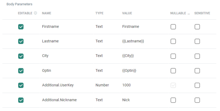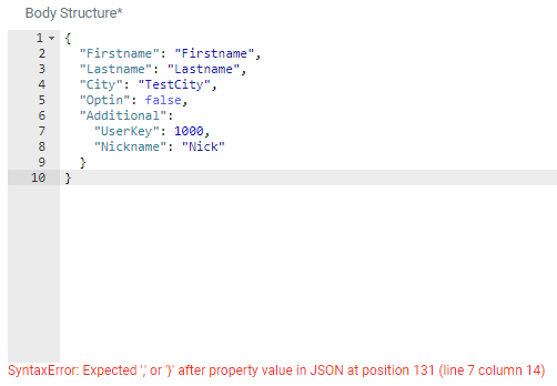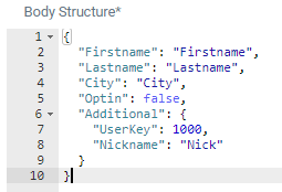 As soon as valid JSON content has been pasted into the Body Structure area, values are automatically replaced by placeholders (eg. {{Firstname}}) :