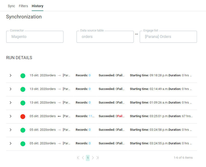 The history of a data sync provides details on previous executions; This includes