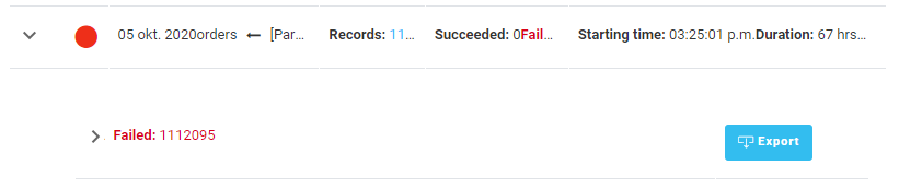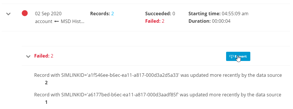 Failed records for which an error message is returned, can be exported to a CSV file. An Export button is available to launch the export. This Export button will NOT be available when the cause of the failed record is UNKNOWN or when there are no failed records.