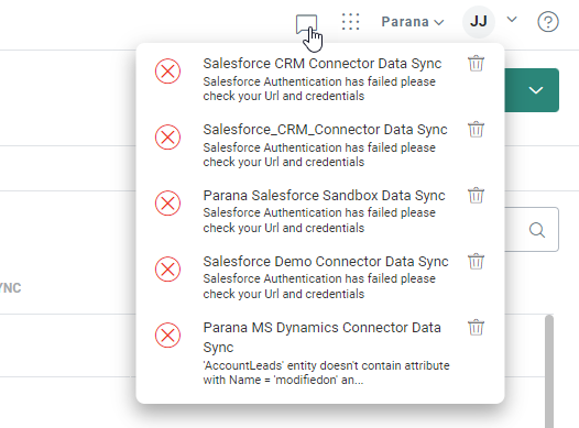 Note: When a data sync generates an error, this error will also be visible from the notifications in the top menu bar. Clicking a notification takes the user to the specific task's page.