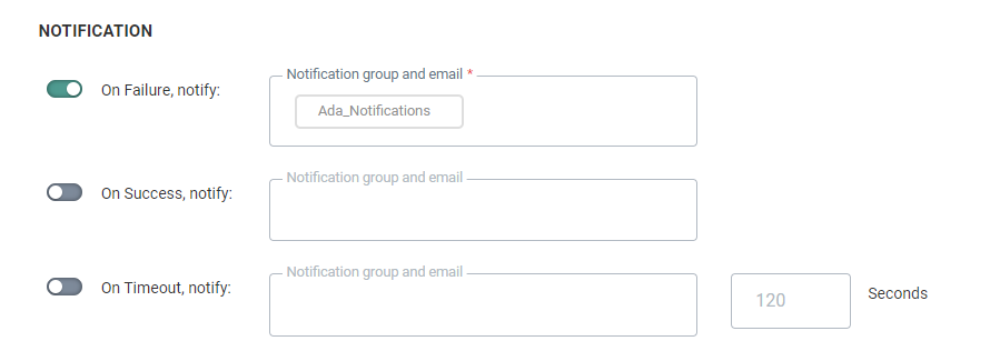 Note: Notifications are optional. When enabling one or more notifications, you need to provide at least one email address or group for each enabled notification.