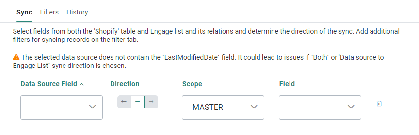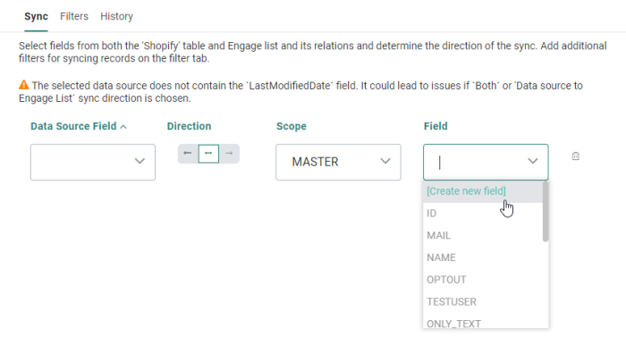 The sync tab lets you define the Data source fields that need to be synchronized with the Selligent fields. A mapping between the fields is defined as well as the direction of the sync. Selligent fields can be selected from the parent list as well as linked lists.