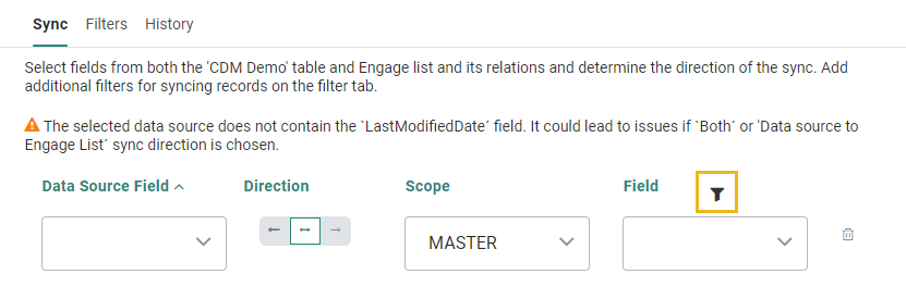 When a filter is set for either the Data source fields or the Selligent fields, this is indicated by a filter icon () next to the corresponding header on the 'Sync' tab.