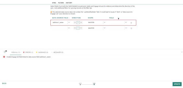 Note: Once you have defined the settings in the Sync step (created at least one record), and you return to the Setup step to change the connector, data source table or Selligent list, a warning states that all sync settings will be lost.