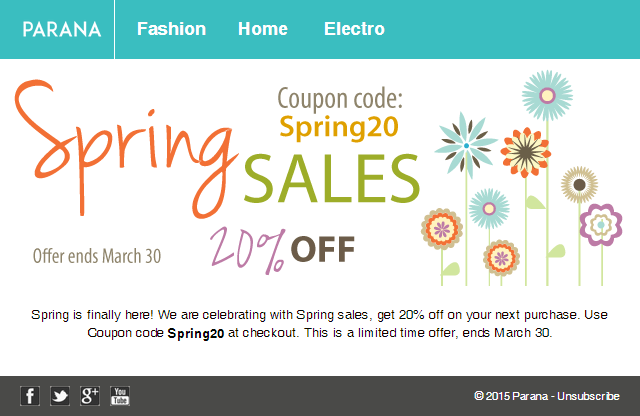 In this example, we are going to create an email template by importing and tweaking an existing HTML file (and images) in the Wysiwyg Editor in Selligent by Zeta, to announce our Spring sales. This basic email template will have fixed content : a generic header and footer, and some body content.