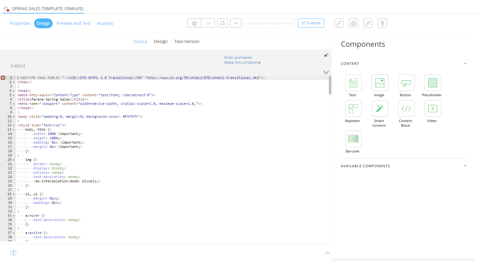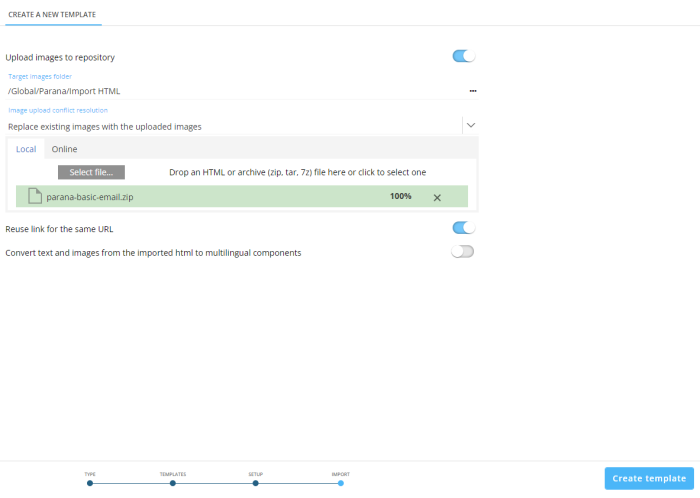 • As we only create the email template in a single language, there's no need to 'Convert text and images from the imported HTML to multilingual components'.
