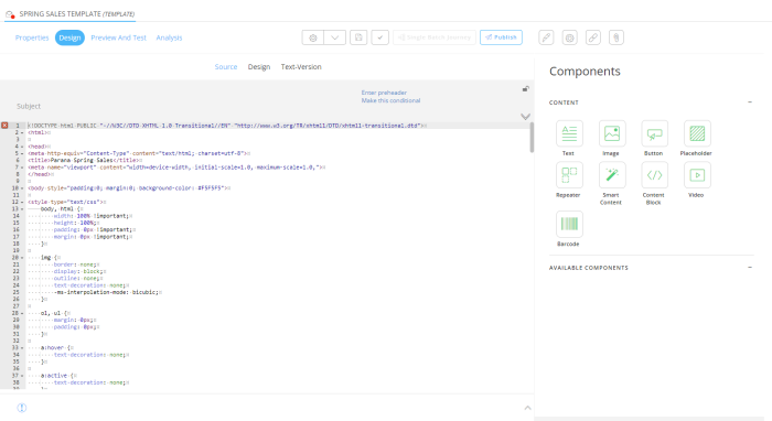 1. The Spring Sales email template is created and is shown in the source view of the Wysiwyg editor :