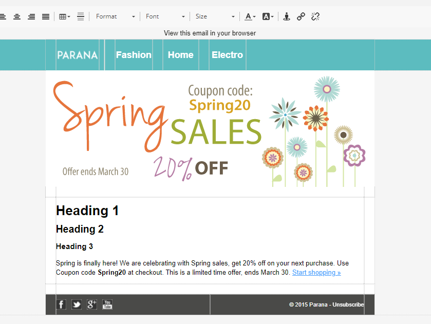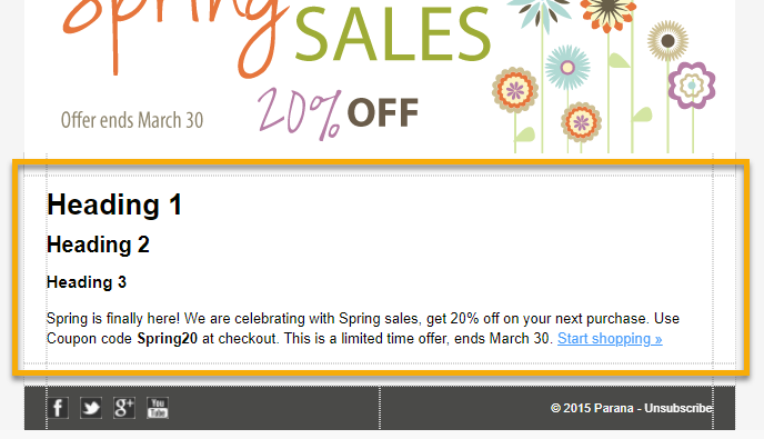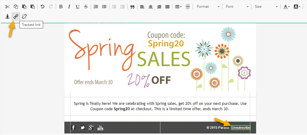 In the email template's footer, at the right there's a text saying 'Unsubscribe'.