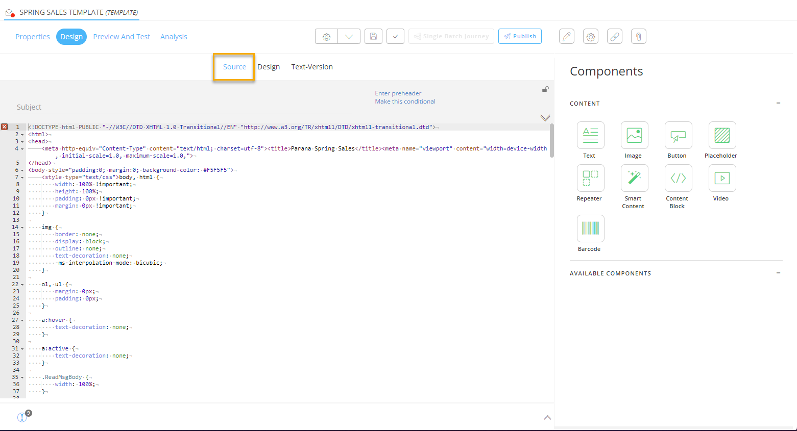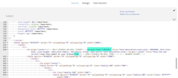 1. Web version link — In Source mode, this can be achieved by setting the correct href link in the <a> tag on the "View this email in your browser" text, which is "LINK(0)".