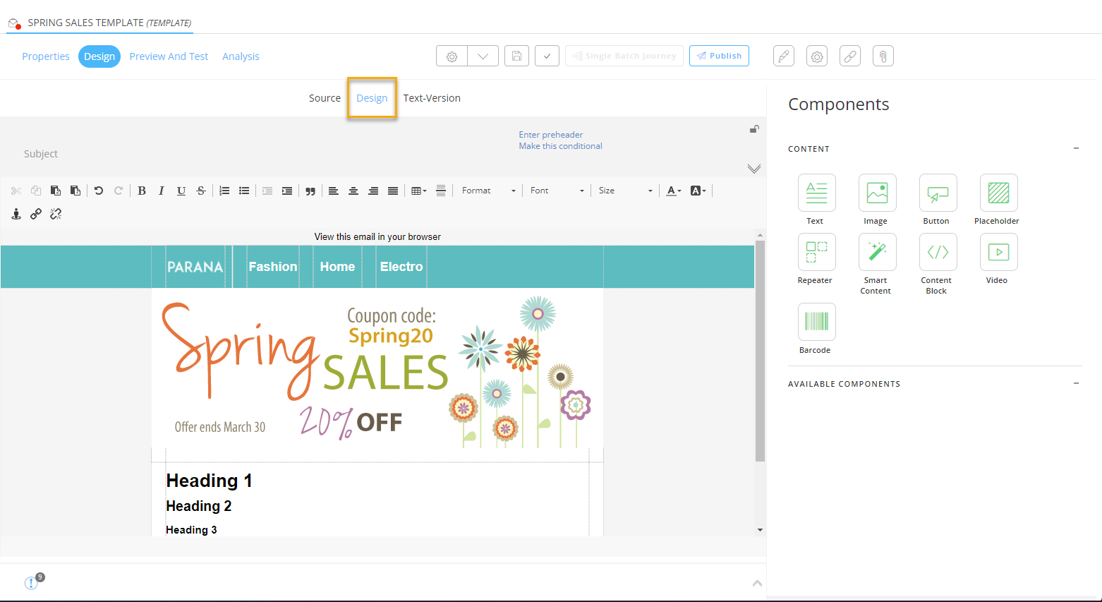 4. Body text content and styling ("Spring is finally here!...") — The text content with applied styling can be seen and edited in this paragraph in Source mode.