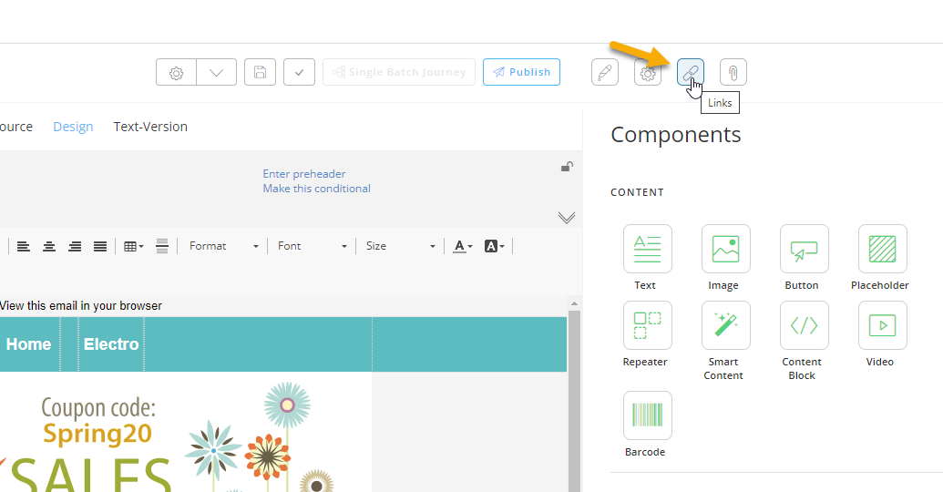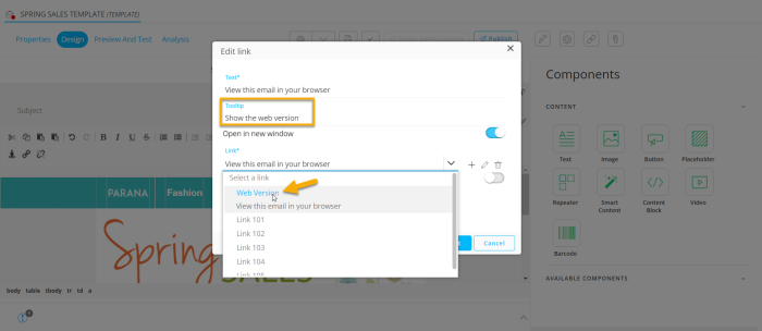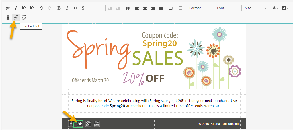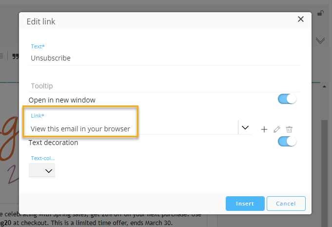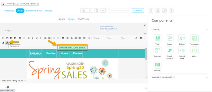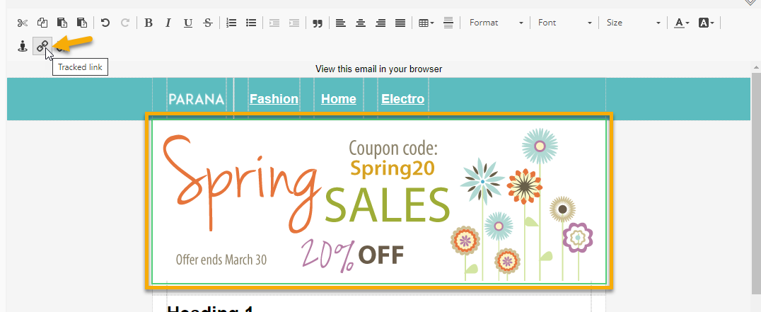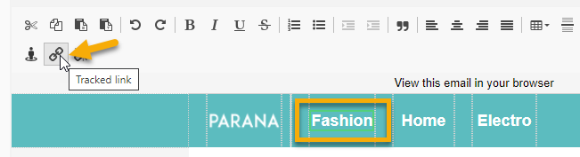 Select the 'View this email in your browser' text, and click on the 'Tracked link' icon.