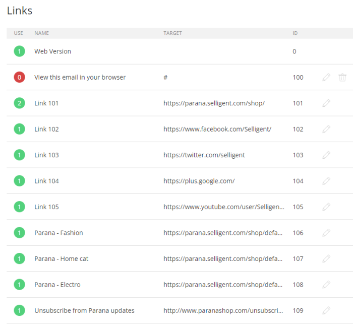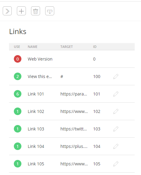 - In the 'Links' properties of the email template, you can see that the created links are visible, and being used :