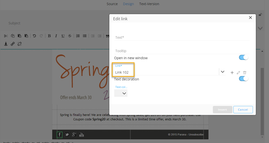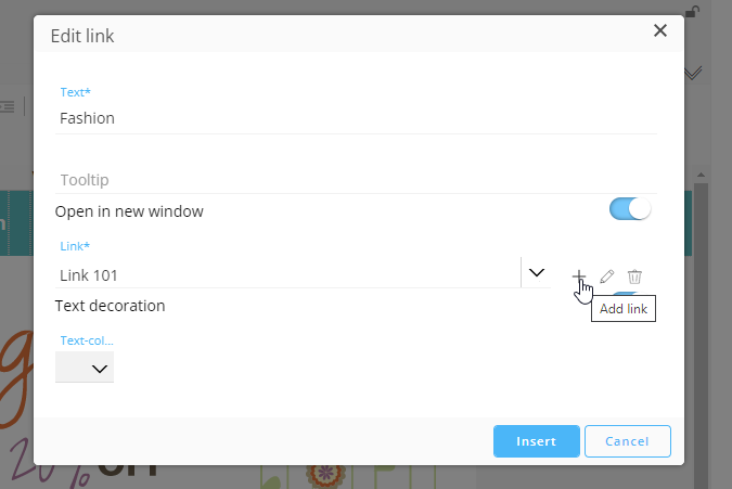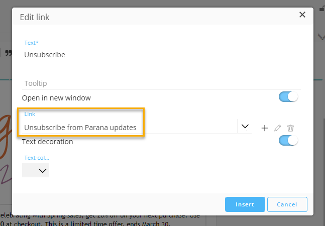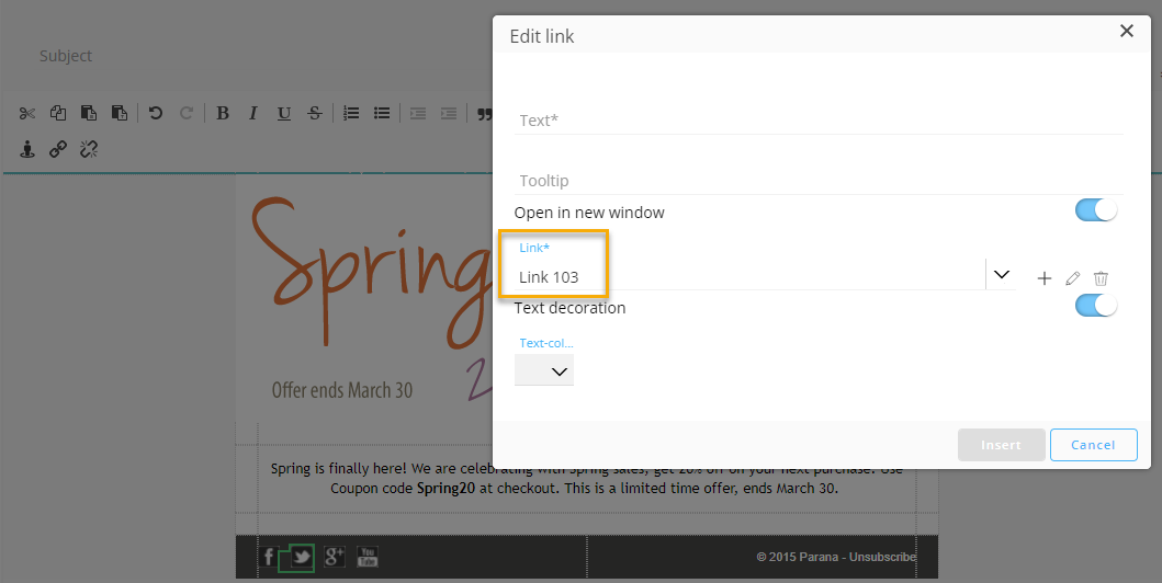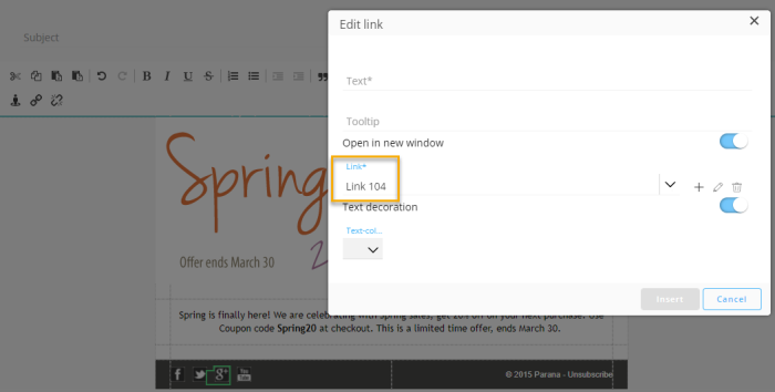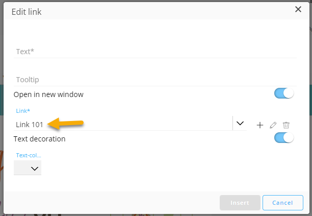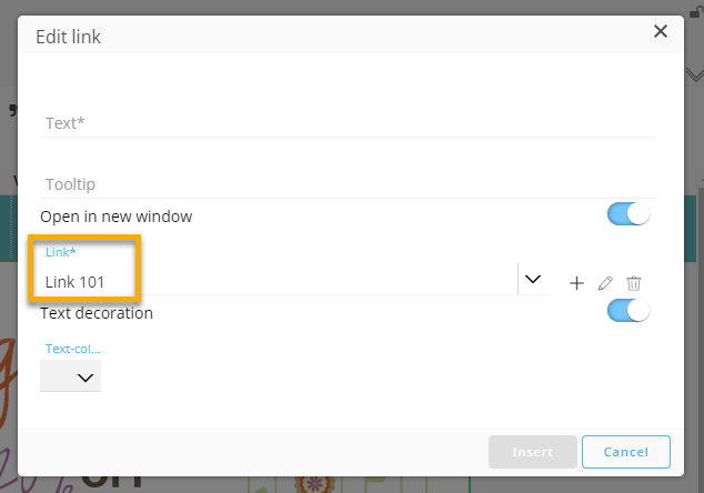- The 'Link' field value gets updated automatically to your entered link name. Click 'Insert' :