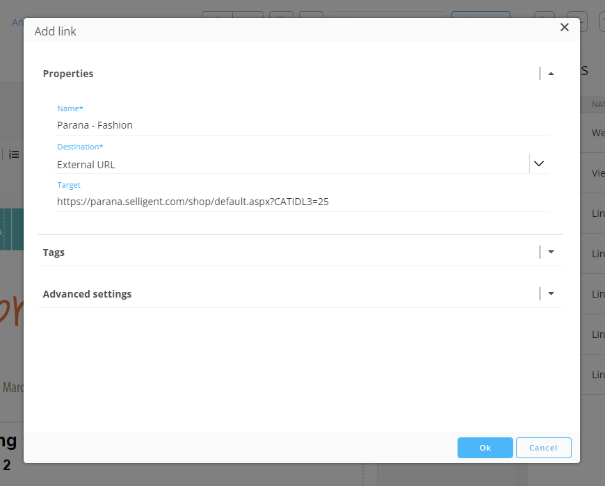 - Enter a link name, set an external URL as target, and click 'Ok' :