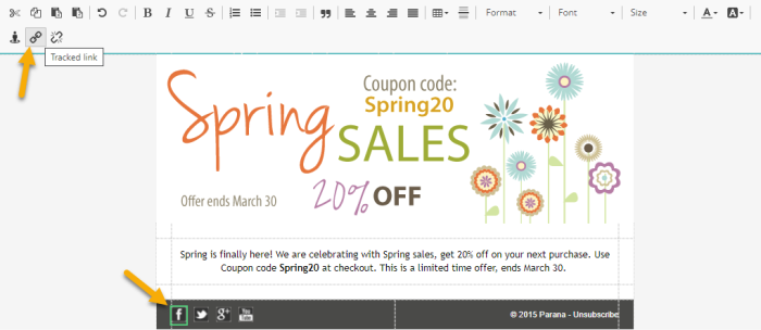 • Facebook — Click on the Facebook icon in the footer and on the 'Tracked link' icon on top.