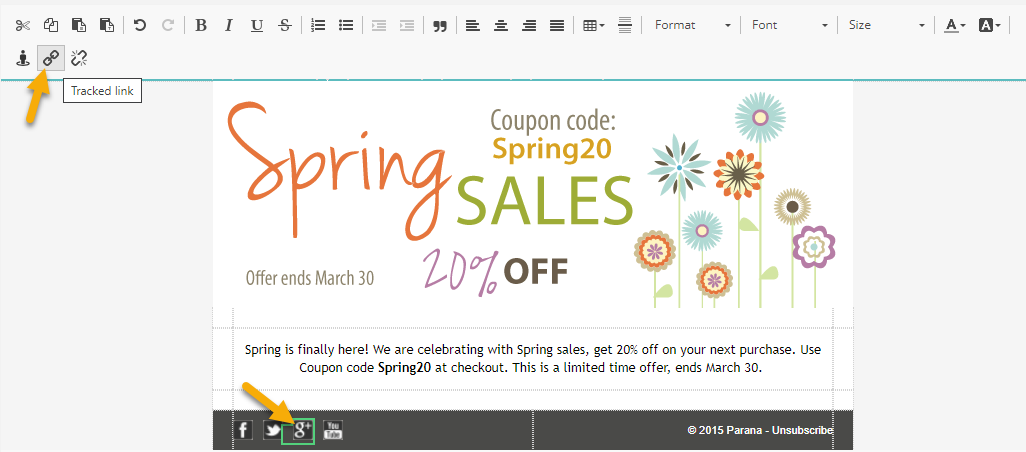 • Google Plus — Click on the Google Plus icon in the footer and on the 'Tracked link' icon on top.