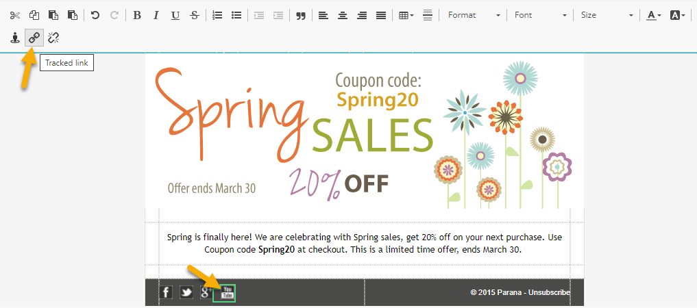 • Youtube — Click on the Youtube icon in the footer and on the 'Tracked link' icon on top.
