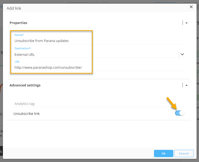 • expand the 'advanced settings' and enable the 'Unsubscribe link' toggle