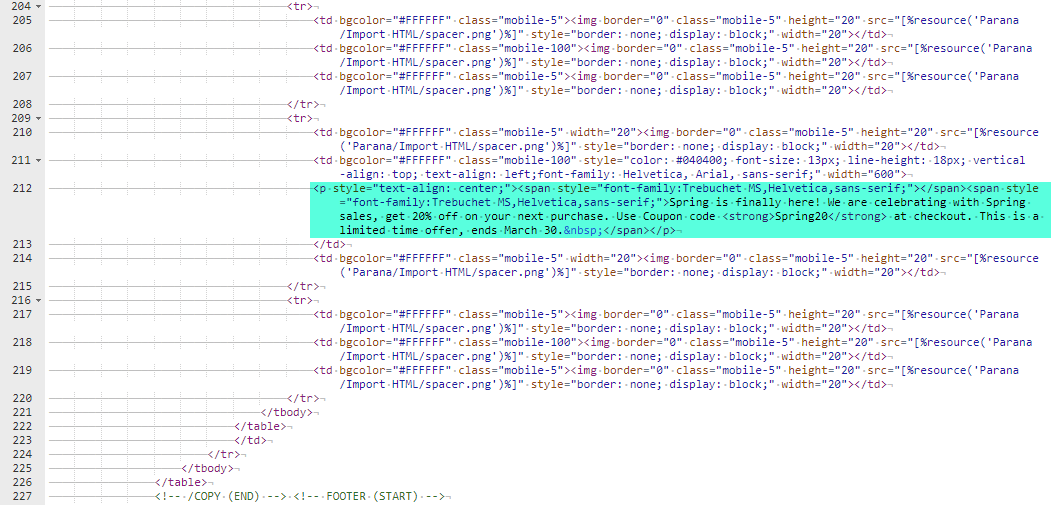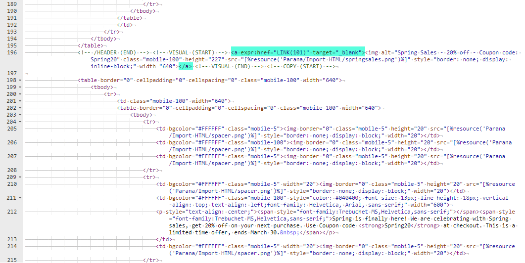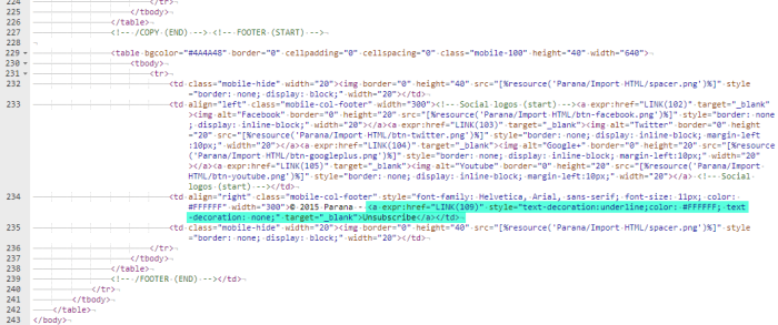 6. Unsubscribe link — The unsubscribe link is also located in the footer, just underneath. Its href value is LINK(109), which is the external unsubscribe URL.