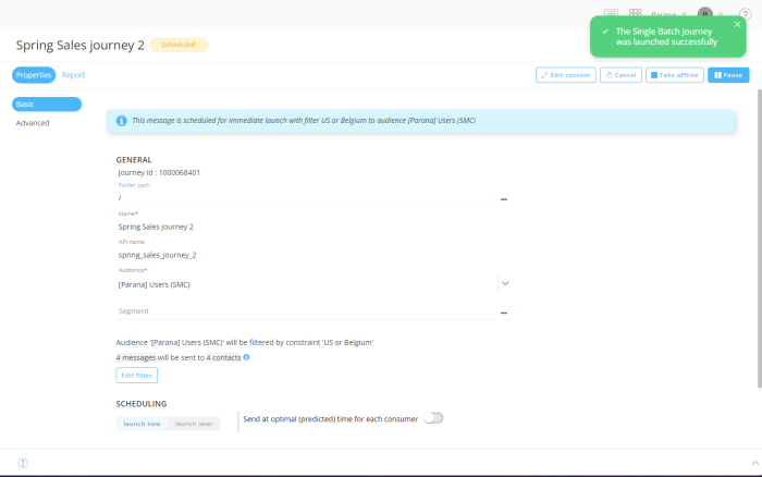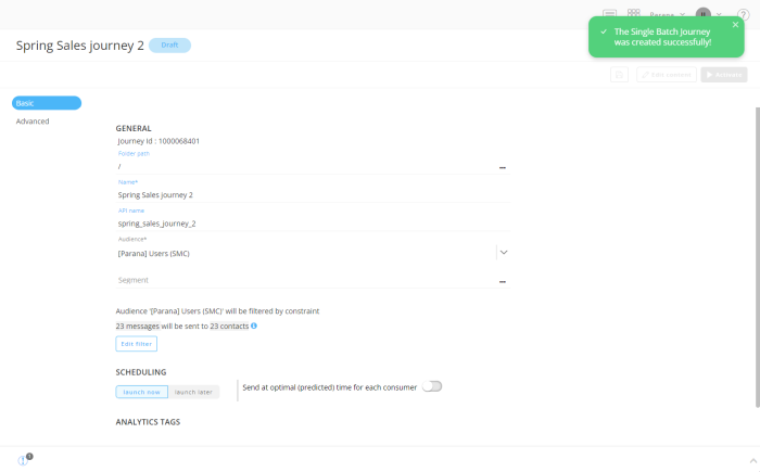 The Single Batch Journey is ready to be activated now, to send out the email, based on the template, to the filtered contacts.