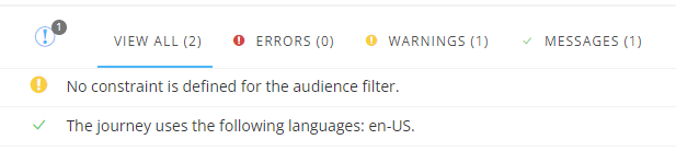 Notice that in the validation pane at the bottom, there's a warning saying 'No constraint is defined for the audience filter', which means that if we would activate this journey now, the email would be sent out to the entire audience.