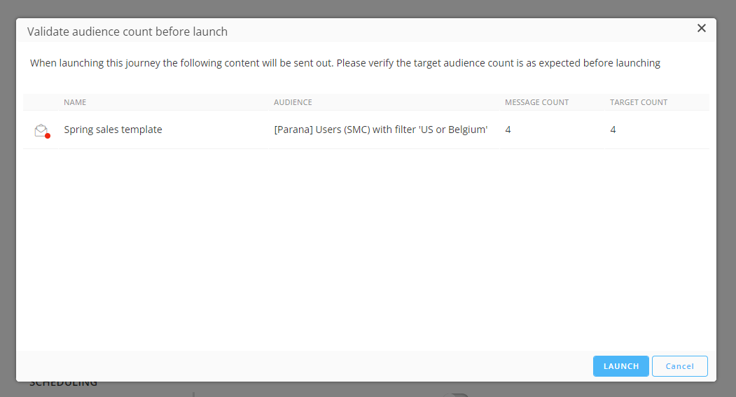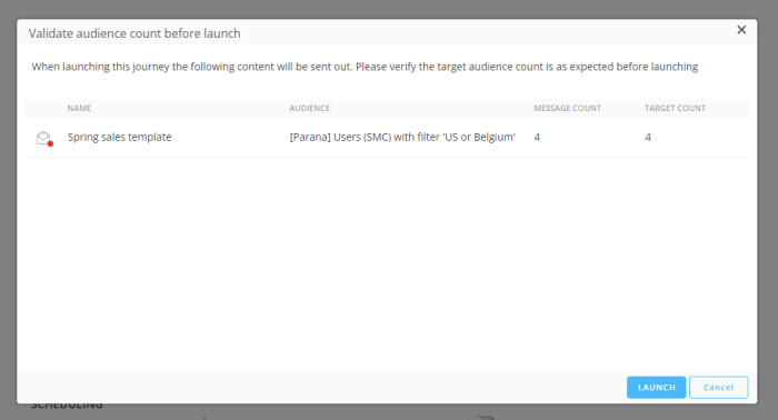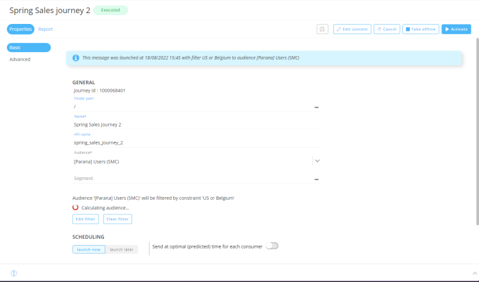 Note: The Selligent by Zeta page is not automatically refreshed, so you'll need to refresh your browser's page or close/re-open this journey to see the state change and launch info.