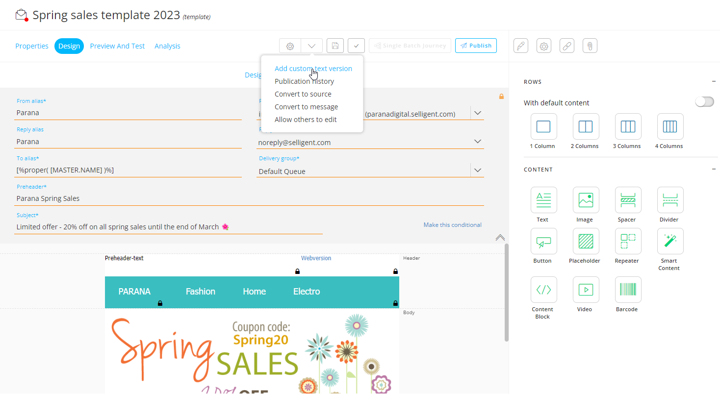 Note: Each email/template message must have a text version because, in some cases, the recipient's email client is unable to read the HTML version and the text version is used instead. A text version is automatically extracted upon publish (more info can be found here), but we opt for a manual text version extraction that can be customized afterward.