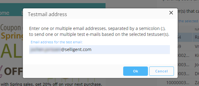 Note: Instead of sending a testmail to a manually entered email address, you can also send it to a test contact from the Audience List, by simply selecting it on the right and clicking the 'Send testmail' button.