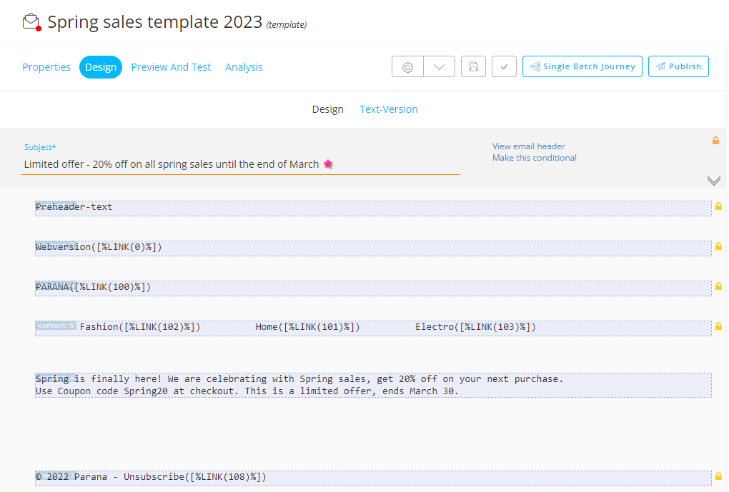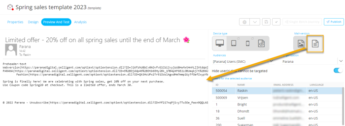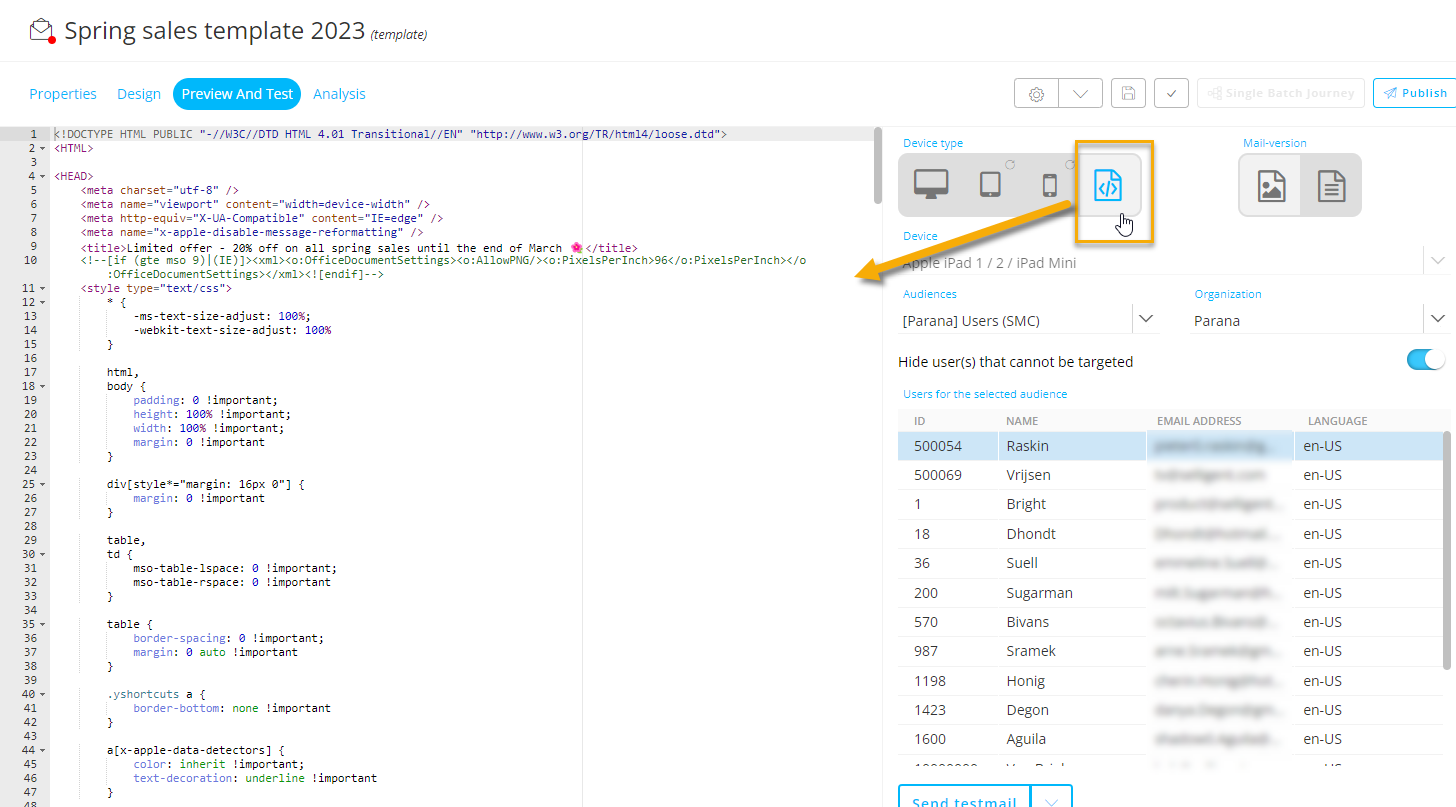 4. Next to the 'Device type' buttons, you can also click on the 'Mail-version' buttons to switch between the design view and the text version of the template.