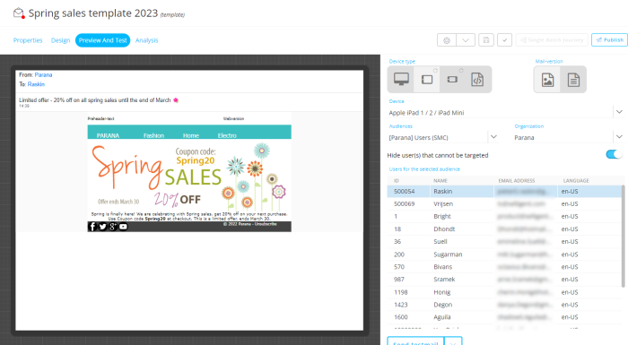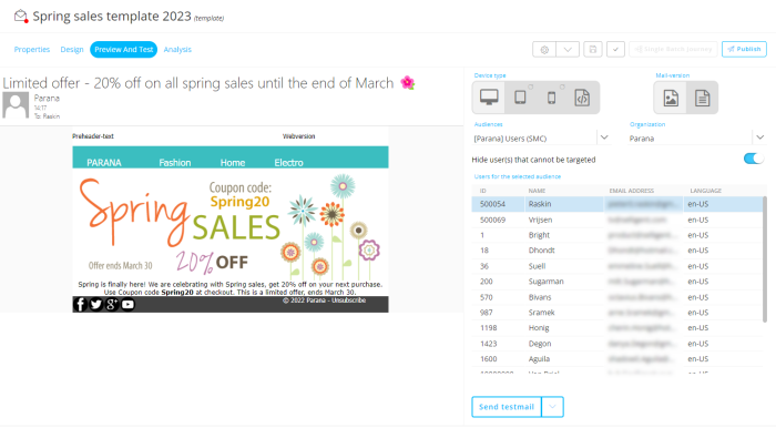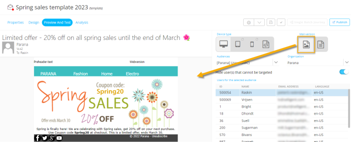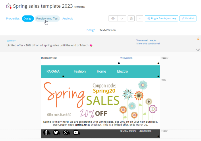 Example: A basic template creation in the Responsive Design Editor, step by step — 5. Test/Preview the email