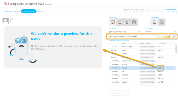 You can disable it to show all available test users from the selected Audience List in the Business unit, including the ones with another or no language.