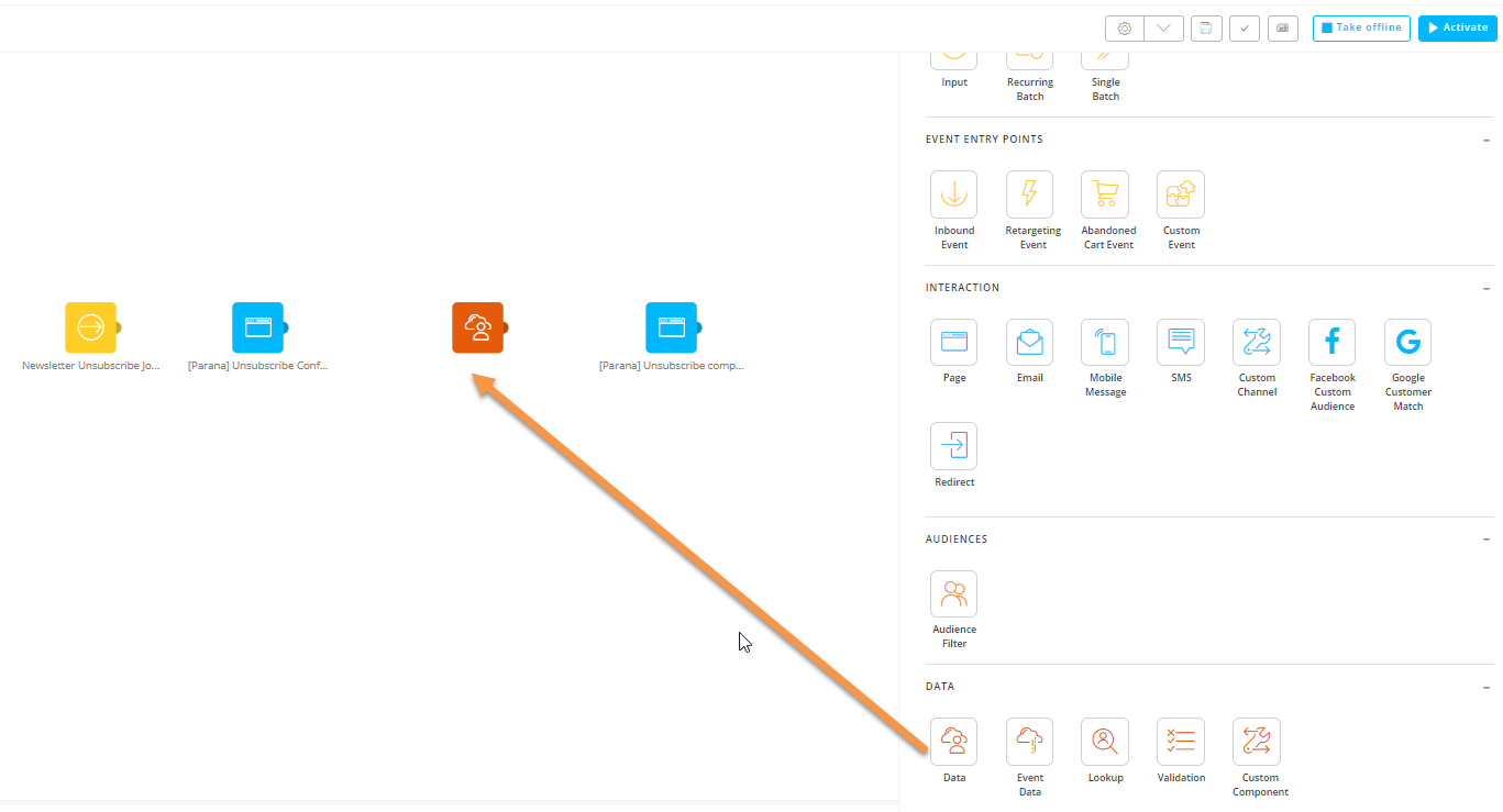 4. When a contact clicks the unsubscribe link on the first page, you need to change to value of the contact's field OPTIN_NEWSLETTER in the Audience List to zero (0) so they are unsubscribed. To achieve this, add a Data Component in between the two pages from the Components panel on the right side.